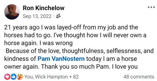 Ron Kinchelow was a loyal friend and a man with a deep love for horses. Though he may not have been a professional horseman, his connection to horses—especially Kah Ching—was something special. Ron got Kah Ching in September 2022, and she quickly became part of his world.
